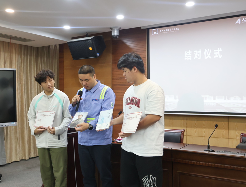 活动伊始,任一波为竺士杰颁发“技能导师”聘书。随后,竺士杰与汽车智能技术专业两位新生程炜旭、兰郑磊进行师徒结对,并赠送其所著书籍,双方交换定制结对卡。
