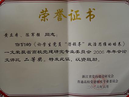 5月31日,浙江省普通高校党建研究专业委员会年会在浙江师范大学隆重召开,我院黄立本、陈军强两位教师撰写的论文《论学生党员“潜领导”政治思维的培养》喜获二等奖,这也是全省众多高职院校中唯一获得二等奖的参赛论文。