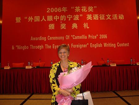 | 为了表彰在过去一年中为宁波市的改革开放和经济建设做出积极贡献的外国专家,经报市政府同意,我院Carman Anne Louise 女士荣获宁波市2006年“茶花纪念奖”,为学院赢得荣誉。宁波市政府为此在东港波特曼大酒店举行了隆重的颁奖典礼,宁波市副市长邬和民为获奖者颁发了奖章和证书。