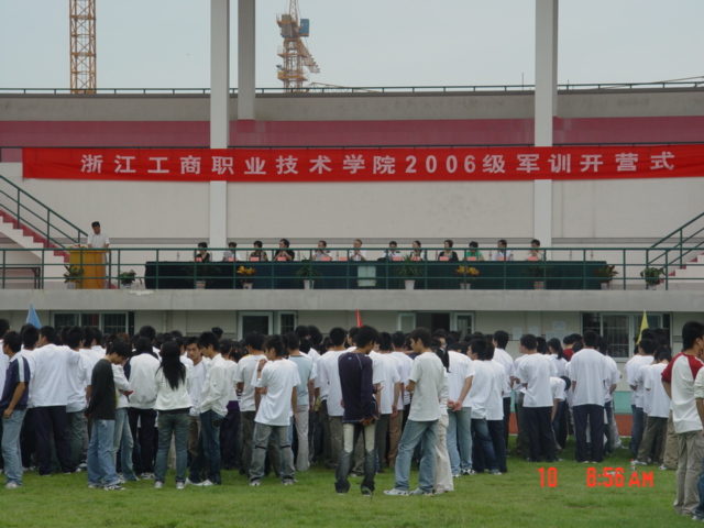 | 9月10日上午8:30我院2006级新生军训开营仪式在田径场隆重举行。院党委书记陈国方、院长助理应金萍及院军训领导小组全体成员,中国人民解放军92587部队团长于发堂、副团长蒋世民及全体教官、各班班主任、2006级全体新生参加了开营仪式。仪式由院学生处处长韩包海主持。 开营仪式上,学院党委书记陈国方作了讲话,他首先代表学院祝贺全体教师第22个教师节快乐,并指出军训是提高全民国防意识和加强国防后备力量建设的重要环节;也是大学生活的一段特殊的人生历程。学生要以饱满的热情、旺盛的斗志、顽强的毅力、威武的军姿、凌厉的气势来展现工商学子的勃勃生机和奋发向上的精神风貌,展现新一代大学生的风采,为自己的大学生活和整个人生历程增添激越昂扬的华彩篇章。同时,陈书记向全体参加军训的新生提出了以下几点希望:第一,要自觉遵守军训的各项要求,自觉遵守各项规章制度。要发扬艰苦奋斗、吃苦耐劳的优良作风,严格要求、严格训练。学生党员、学生干部要充分发挥先锋模范作用。第二,要把军训成果转化到创建优秀高职院校的各项工作中去。今年,我院将迎来教育部人才培养工作优秀评估,学校正面临创建优秀高职院校,全面提高人才培养质量的关键时期。全体参训同学要把在军训过程中形成的好传统、好作风、好习惯保持下去,发扬光大,用实际行动,为母校的发展,为自身的发展作出贡献!