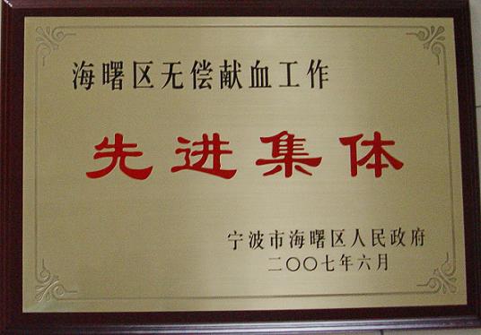 | 根据宁波市海曙区人民政府《关于表彰2000--2006年度无偿献血先进集体和先进个人的通报》文件(海政[2007]5号),我院被评为海曙区2000--2006年度无偿献血先进集体,周素琳和屠迪峰被评为2000--2006年度无偿献血先进个人。