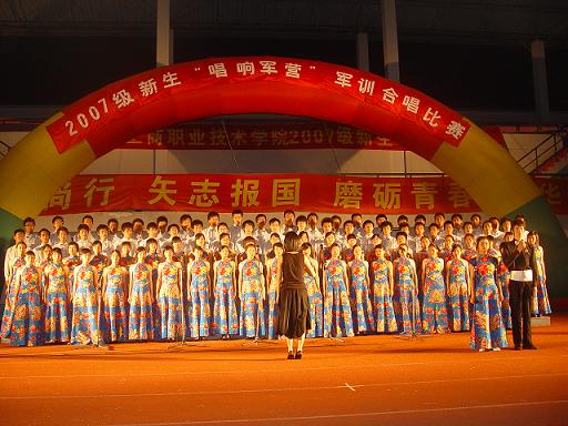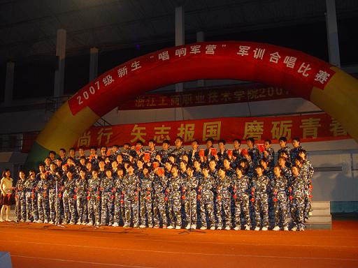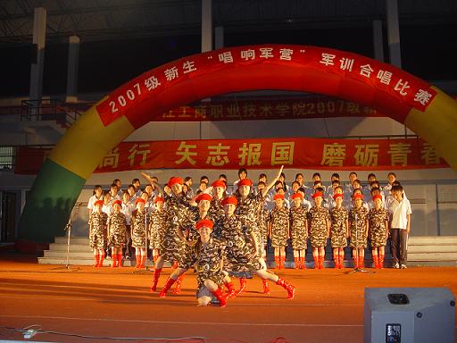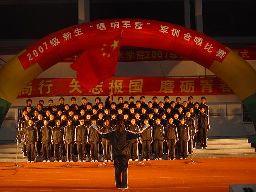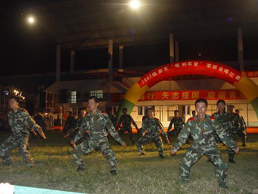 | 9月21日晚的体育场迷彩飞扬,军歌嘹亮,2007级新生“唱响军营”军训合唱比赛在这里隆重登场。全体军训学员身着统一服装,迈着整齐的步伐在舞台上逐一亮相,高亢激昂的歌声博得场下观众阵阵掌声。各位教官以倒功和擒拿拳为比赛助兴,响亮的口号、坚毅的身姿、干脆利落的动作更赢得同学们的阵阵欢呼。