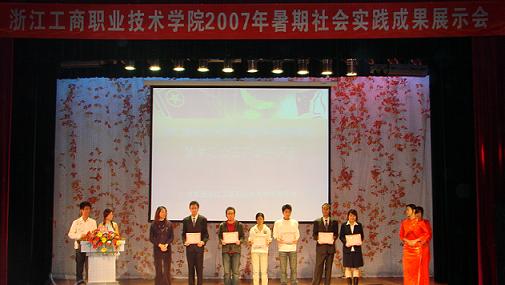 学校党委副书记应金萍老师为大会致辞,她首先代表学校党委向组织暑期社会实践的全体团学干部致以崇高的敬意和衷心的感谢,向圆满完成各项实践任务并取得突出成绩的同学们表示诚挚的祝贺。应副书记总结了今年暑期社会实践活动的基本情况和特点,肯定了团委和各分院所做出的努力。她指出:“实践育人才,服务助成长”,社会实践作为大学生提高综合素质的有效途径,它既是大学生增长知识、才干的最佳途径,也是大学生正确认识自我、完善自我的理想渠道。本次实践活动结合了文化普及、知识宣讲、支教支农、文艺演出、志愿服务等多种形式,同学们在社会实践中达到了“体察社会、磨练意志、提高能力、服务人民、回报社会”的预期目的。希望大家再接再厉,认真总结经验,不断探索创新,使学院大学生暑期社会实践活动保持旺盛的生机和活力,也希望有更多的同学加入到社会实践活动中来,抓住机遇,锻炼自我,服务社会,在社会实践中实现自身价值! 随后,校团委副书记任一波老师宣布了2007年暑期社会实践获奖名单,学校党政领导和各分院党总支书记为获奖的同学颁发了证书。 在隆重的颁奖典礼之后,各分院暑期社会实践优秀团队还通过DV短片、PPT和精彩表演等形式展现了团队风采和实践的成果,引起台下观众的共鸣。 据悉,今年我校以服务新农村重点服务团和百家社会实践基地建设等为内容,组织了70多个团队、近千名大学生奔赴全省各地开展了丰富多彩的“三下乡”暑期社会实践活动。据不完全统计,活动过程中共发放宣传资料20000多份,举行政策宣讲会20多场,举办各类文艺演出10多场,技术服务农民3000多人次,调查报告150多份,另外,《宁波日报》、《东南商报》、东钱湖电视台、北仑电视台、镇海电视台、宁波青年网、中国大学生网、北仑春晓镇政府网等多家新闻单位还对我校社会实践活动情况进行了专题报道并给予了高度评价。 本次展示会凝聚了学生社会实践活动的精华,为同学们提供了一个展示成果、学习交流的平台,使学生们更深入地了解社会各领域,融会贯通课内外的知识和技能。同时,丰富的学生社会实践活动成果展示也吸引了我校2007届新生参与到百家社会实践基地建设活动中来,为学校今后的社会实践工作打下了坚实基础,以优异的成绩向党十七大献礼。