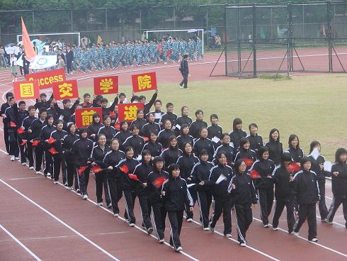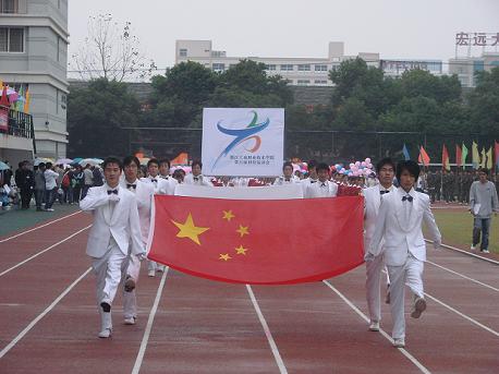 “争做示范”、“再接再厉”、“扬奥运精神”、“为校运争光”,在国旗、校旗、会徽、鲜花队、彩球队、彩旗队的引导下,裁判员、学生、教工运动员高喊洪亮的口号,迈着整齐而又矫健的步伐,从东区入场,伴随雄壮激昂的《运动员进行曲》向主席台前走过,展现出了浙江工商职院人蓬勃向上的精神面貌。入场式结束后,在庄严的《国歌》声中举行了升旗仪式,五星红旗冉冉升起,全场一齐向国旗行注目礼。