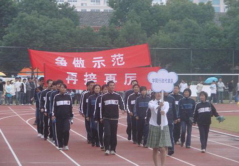 | 11月1日上午,校第六届田径运动会在田径场上隆重拉开帷幕,开幕式由体艺中心主任郭聪聪主持,宁波市大学生体协副主席戴本源、学校党委书记陈国方、院长蔡泽伟、副院长姚奇富,党委副书记应金萍、纪委书记李振祥等领导出席了开幕式。