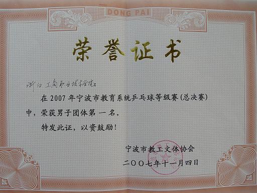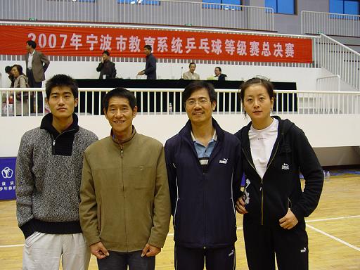 11月3日至4日,“2007年宁波市教育系统乒乓球等级赛总决赛”在东钱湖畔举行,教育系统的乒乓球高手会集于此,展开了一场“颠峰对决”。 最终,由我校纪委书记李振祥率队的乒乓球队脱颖而出,一举拿下男子团体冠军;陈强、王春玲两位老师分别夺得男子单打冠军和女子单打冠军;吕捷强老师获得单打季军。