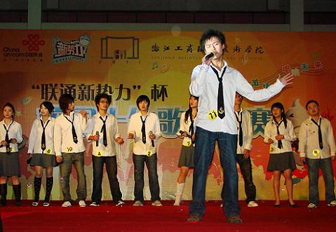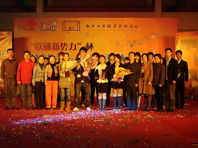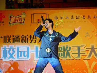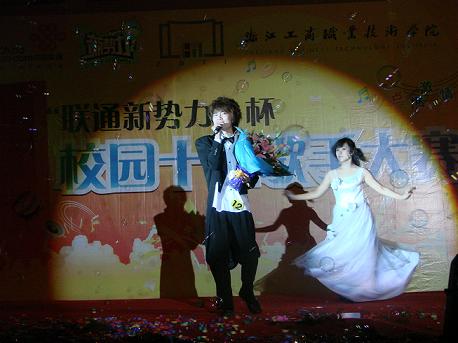 | ----浙江工商职业技术学院“联通新势力杯”校园十佳歌手大赛隆重举行 11月14日晚,学校田径场上人头攒动,人声鼎沸,2007年浙江工商职业技术学院“联通新势力杯”校园十佳歌手大赛总决赛在这里隆重举行。学校宣传部副部长陈建明、学生处处长韩包海、体艺中心主任郭聪聪、团委副书记任一波、各分院党总支书记、副书记、宁波市学联主席出席了晚会。本次大赛由校团委主办、学生会承办,同时得到了中国联通公司宁波分公司的大力支持。 在现场观众热烈的掌声中,参加此次总决赛的13名歌手闪亮登场,首先由13名歌手齐声演唱了一首《年轻的战场》拉开了大赛的序幕。台下的观众随着歌手的尽情表演热情高涨。比赛通过歌手才艺展示、选手DV版自我介绍、乐理知识问答、现场PK、大众评审等环节,经专业评委和大众评审的评定,最终角逐出了各类奖项,来自建筑与艺术学院的俞俊翔同学摘取了本次“联通新势力杯”校园十佳歌手大赛的桂冠,经济管理学院的徐佳燕和国际交流学院的陈腾飞、赵翊然组合分别获得了此次大赛的亚军和季军。由出席大会的几位领导分别为获奖的同学颁奖。 校园歌手大赛在我校已经举办了很多届,已成为学生校园文化活动中的重要组成部分,无论从形式上还是规模上都日趋走向成熟。本次校园歌手大赛首次在露天广场举行,绚丽的舞美灯光、激情的歌曲演绎吸引了数千名师生的观看。