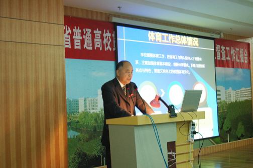 在上午举行的评估汇报会上,院长蔡泽伟首先致欢迎词,欢迎各位专家莅临我校指导体育工作,并向督查组专家介绍了我校的办学历史。 党委书记陈国方作了《学校体育工作条例》评估自评报告,就学校概况、基本建设、课程教学、体育工作效果、创新亮点与特色、我校为评建工作开展的相关准备情况以及我校体育工作今后努力方向等向督查组专家进行了详细的汇报。