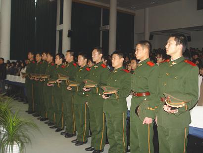 仪式结束后,全体教官和受训学员还观看了国防教育片《士兵突击》。 据了解,本次军训将从1月16日开始至21日结束,受训对象为学校2006级部分学生,其中经济管理学院352人,建筑与艺术学院96人,共计448人。