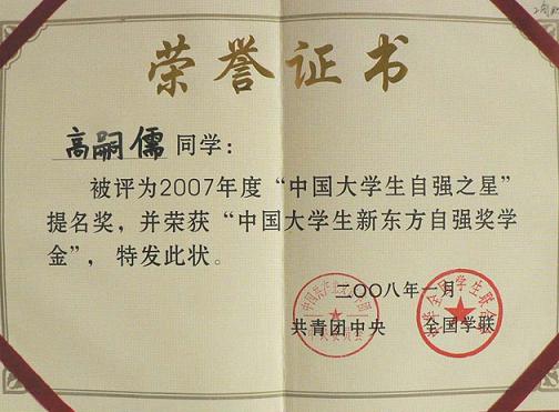 | 近日,由共青团中央、全国学联、新东方教育科技集团主办,中国青年报社承办,安踏(中国)有限公司协办的2007年度“中国大学生自强之星”评选活动结果揭晓,我校中澳国商0661班高嗣儒同学荣获2007年度“中国大学生自强之星”提名奖,并获得了“中国大学生新东方自强奖学金”。这是我校继张小飞同学入选“感动宁波高校十大人物”之后的又一殊荣。