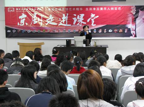 4月14日晚,宁波市京剧名家李孝莲应邀来我校思齐楼作京剧文化讲座,李孝莲老师的精彩讲座,引起了现场学生们的强烈共鸣。这是我校首届艺术节系列活动之一-----“艺术论坛一京剧进校园” 活动。 在近两个小时的讲座中,李孝莲老师一边讲解,一边亲身示范,讲到兴致处,还走到学生身边现场表演了一些京剧选段,李老师唯美的音律和唱腔,将京剧这一国粹演绎得淋漓尽致。现场掌声此起彼伏。