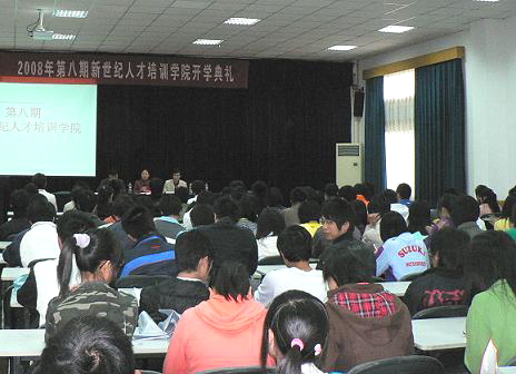 | 为深入贯彻学习党的十七大会议精神,用马克思主义中国化的最新成果武装青年学生,促进青年学生的健康成长和全面发展,4月16日下午,我校第八期新世纪人才培训学院的开学典礼在学校至诚楼报告厅举行,学校党委副书记应金萍、宁波团市委学少部部长任乐波等出席了此次开学典礼,全校近300多名学生骨干参加了此次开学典礼。 在一首庄严而嘹亮的国歌之后,党委副书记应金萍发表讲话,应副书记首先对宁波团市委学少部部长任乐波在百忙之中莅临我校表示热烈的欢迎,向通过层层选拔加入到第八期新世纪人才培训学院的各位学员表示由衷地祝贺。应副书记真挚的希望广大优秀学子秉承“厚德、进业、明智、笃行”的校训,在党校学习期间,认真学习,勤于思考,充分学习党的先进理论,树立正确的人生观、世界观和价值观,以实际行动报效祖国,争取早入加入到中国共产党这个先进组织中来。最后应副书记给在场的学员提了三点要求:一是要志存高远,胸怀大志。作为新一届的新世纪人才培训学院学员要珍惜这次学习的机会,树立远大的理想,饮水思源、爱国荣校。二是要把握机会,勤奋务实。学员要树立“处处是学习之地,时时是学习之机”的理念,刻苦学习,不断提高。三是要争做表率,不断进取。学员要在学习、生活、工作各方面都能争做表率,带动周围的同学共同进步,并向全校学生、乃至全市学生展现我校新世纪人才培训学院学员的蓬勃的朝气、进取的勇气和创新的精神,树立我校新世纪人才学校的良好品牌。