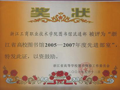 日前,在全省高校图书馆馆长会议上,我校图书馆流通部被浙江省高等学校图书情报工作委员会评为“浙江省高校图书馆2005-2007年度先进部室”;毕惠芳同志被评为“浙江省高校图书馆2005-2007年度先进工作者”。 浙江省高校图书馆先进部室奖项每三年评选一次,此次能荣获本项殊荣,是对我校图书馆工作的极大肯定。