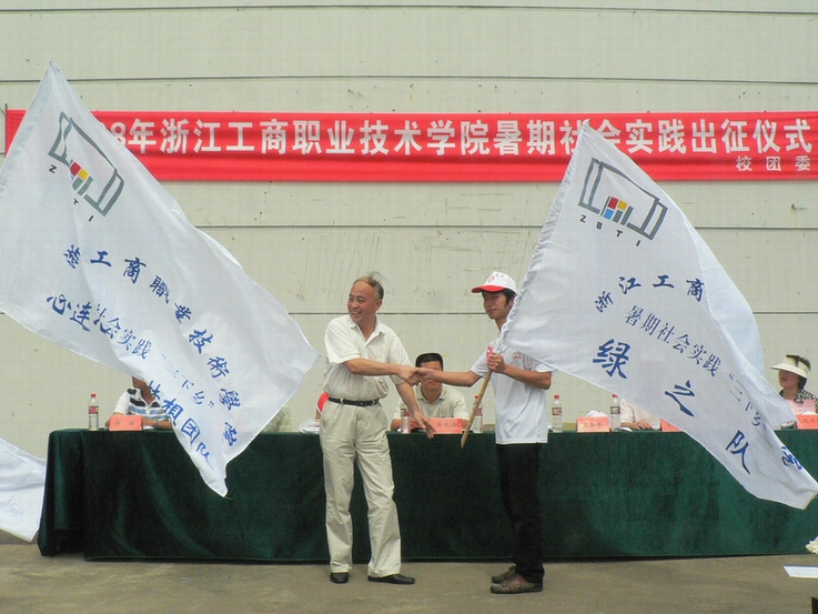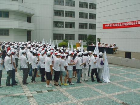 | 6月30日,浙江工商职业技术学院2008年“勇担强国使命、共建和谐家园”为主题的大学生暑期社会实践出征仪式在学校绿色小广场隆重举行。党委书记陈国方、党委副书记应金萍等校领导出席了此次仪式。各学院党总支负责人以及实践团队队员700余人参加了仪式。