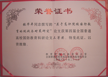 11月1日-11月4日, 在重庆大学举行的第四届全国普通高等学校国防教育科研论文评选中,我校张华平老师《关于高职院校国防教育的现状与对策研究》一文获得全国三等奖,教育部体艺卫司杨贵仁司长亲自为此次获奖的教师颁奖。 据悉,此次获奖论文由全国26个省市地区选送的721篇文章中评出,浙江省高校仅有4篇文章获奖。