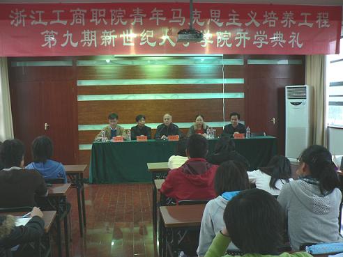 | 11月11日下午,我校隆重举行了青年马克思主义者培养工程暨第九期新世纪人才学院开学典礼。党委书记陈国方、党委副书记应金萍及相关部门负责人出席了本次典礼。来自各个分院的100多名学员参加了本期新世纪人才学院的培训。 会上,陈国方书记首先对参加第九期新世纪人才培训学院学习的同学表示祝贺,并向同学们提出了四点殷切希望:要学会选择,胸怀天下;要勤奋务实,用于实践;要争做表率,勇于成功;要不怕失败,提高抗挫折能力。 电脑0821班的袁志林同学代表本期的100余名学员在会上发言,表示将会在培训过程中严格遵守规章制度,认真学习,争做表率。