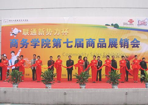 | 11月26日下午,“联通新势力杯”第七届商品展销会剪彩仪式在绿色小广场隆重举行,副院长王国良、纪委书记李振祥等校领导、特邀嘉宾联通公司副总经理王凌和学校相关部门负责人出席了仪式。 剪彩仪式上,纪委书记李振祥为本次商品展销会致辞,他指出商务学院在“探索实战型教学方式、培养现代商帮人才”方面进行了积极的探索,通过搭建商品展销会这一平台,在专业教师的指导下让同学们全程参与展销会的各个环节,极大地锻炼了同学们在招商引资、展会促销策划、商务经营、企业管理、公关庆典设计等方面能力,同时达到了团队意识培训的目的,更为学生今后就业打下了坚实的基础。最后祝活动取得圆满成功。