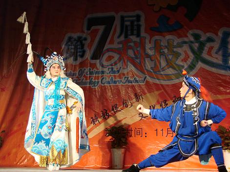 浙江京剧团的演员们先后为观众表演了经典剧目《三岔口》和《王者-俄狄》,他们精彩的表演博得了全场热烈的掌声。其中京剧《王者-俄狄》是该剧团曾远赴西班牙演出的剧目,戏中著名京剧武生翁国生连续用武小生、官生、落魄穷生三种不同的京剧行当来塑造“俄狄王”这一独特的舞台形象,剧中他首次让京剧男演员飘耍起了近3米长的超长水袖,边唱边舞,吸引了所有观众的目光,加之深厚的唱功,将全场演出推向了高潮。演出结束后,我校相关部门领导还上台与演员们握手致谢并合影留念。