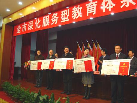 | 12月4日,在全市深化服务型教育体系建设工作会议上,我校申报的“打造宁海产学研基地,促进区域经济发展”项目荣获宁波市教育服务经济贡献奖二等奖,并获得了50万元的奖励经费。宁波市委书记巴音朝鲁、市长毛光烈为获奖单位颁奖,我校党委书记陈国方代表学校上台领奖。