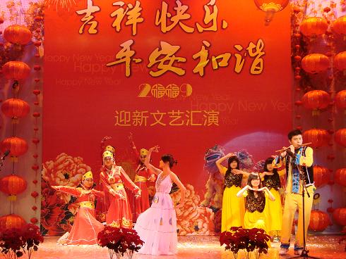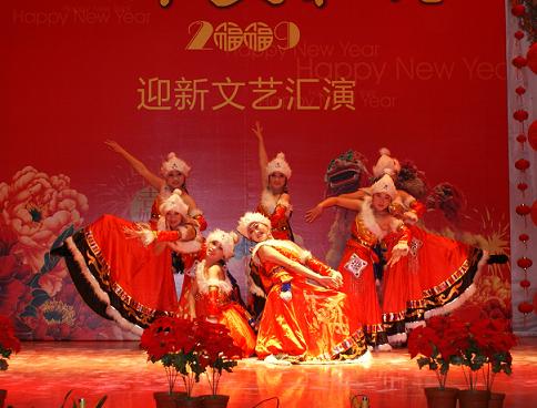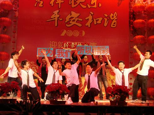 随后,本次晚会的重头戏2009迎新文艺汇演拉开了帷幕。2009迎新文艺汇演节目丰富多样,精彩纷呈,有爆笑全场的小品《难忘的2008航班》、感人至深的诗朗诵《中国人》、温馨浪漫的音乐剧《送你一束玫瑰花》等,演员们精彩的表演将联欢会推向了一个又一个高潮。最后,由教辅分工会田军、蒋金山等表演的舞蹈《穷开心》以风趣幽默的风格,得到了评委的认可,夺得了一等奖;行政分工会张军、励业等表演的音乐剧《送你一束玫瑰花》和建筑与艺术学院分工会贾辉、胡巍等表演的小品《难忘的2008航班》荣获二等奖;国际交流学院分工会、商务学院分工会、信息工程分工会表演的节目分别荣获三等奖。