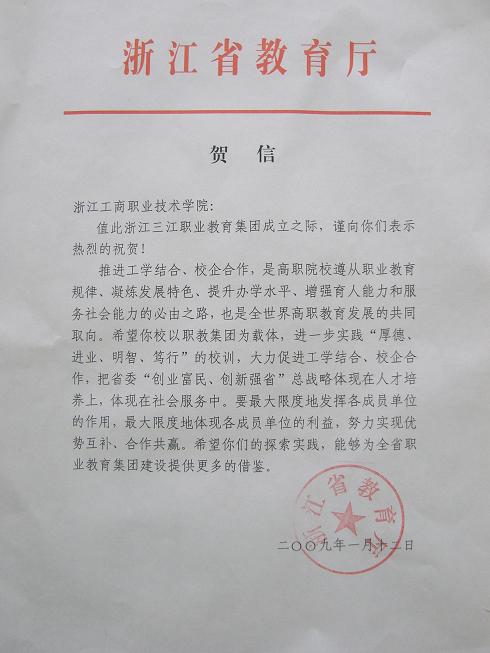 | 1月15日,浙江三江职业教育集团正式在我校成立。从此,一个规范化、集团化、服务型的校企合作平台及与地方经济互动共赢的高职教育服务体系初步建立,将为全省经济社会发展提供重要的智力支持和人才支撑。省委教育工委委员、省教育厅副巡视员夏建勇、宁波市政府副秘书长陆勇、省商业集团有限公司党委副书记陈向明、副总经理蔡玉林、宁波市教育局局长助理胡赤弟等领导出席了大会,三江职业教育集团成员单位代表、兄弟院校代表及我校全体党政领导、教师代表共150多人参加了本次成立大会。浙江省教育厅还专门发来贺信,祝贺浙江三江职业教育集团正式成立。大会由我校蔡泽伟院长主持。