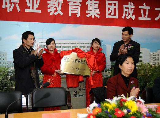 随后,省委教育工委委员、省教育厅副巡视员夏建勇和省商业集团有限公司副总经理蔡玉林为浙江三江职业教育集团揭牌;主席台领导向各理事单位现场颁发了理事单位证书。会议结束后,与会领导及理事代表还一起合影留念,并在我校领导的陪同下参观了学校ERP实训室、旅游实训室、GE FANUC自动化系统集成实验实训室等校内实训基地。 浙江三江职业教育集团是由我校发起,以专业、行业为纽带,现有全省24家知名企事业单位和8所职业学校为成员单位,依托省商业集团有限公司和宁波块状经济发展优势,围绕“总部----基地”办学模式而展开的一个相对松散型的校企合作组织。