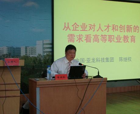 报告会上,陈继权先生主要围绕三个方面谈了自己对高等职业教育的理解和看法,剖析了当前高等职业教育改革与发展的要求和方向:一是从产业角度谈人才与创业的需求;二是从产业角度谈高等职业教育的问题与对策,三是提出要加强实训基地建设,以“做中学”提高学生动手能力。陈继权先生还具体阐述了国际社会对人才的定义、企业对人才的评价过程,指出职业教育要通过教育思想、体系、内容、方法、手段的创新来培养高素质人才,强调高等职业院校要加强实训基地建设,使学生在做中学,发现学生价值,发掘学生潜能,发展学生个性。