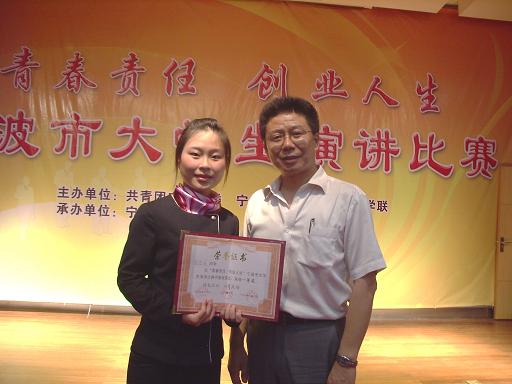 | 为纪念“五四”运动90周年,引导全市大学生积极学习实践科学发展观,由共青团宁波市委、宁波市教育局、宁波市学联主办的以“青春责任 创业人生”为主题的大学生演讲比赛于5月15日隆重举行,我校参赛代表国际交流学院国商(中澳)0571班学生朱逸婷凭借出色的发挥,以9.67分的全场最高分夺得了本次大赛的一等奖。