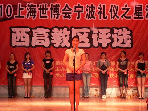 | 6月6日,“迎2010世博会,宁波礼仪之星大赛”西高教园区选拔赛在我校博学楼报告厅举行。来自宁波大红鹰学院、宁波工程学院、浙江传媒学院、浙江工商大学、浙江师范大学、浙江旅游职业技术学院、温州大学、浙江医药高等专科学校、中国计量学院、湖州师范学院等全省10多所高校近500余名参赛选手参加了本次选拔赛。