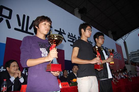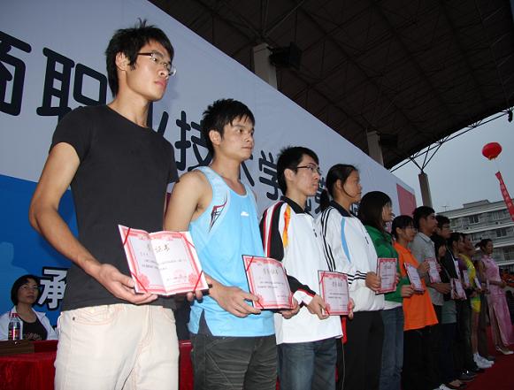 首先,校团委副书记任一波宣读阳光体育冬季长跑活动倡议书;总裁判长田军宣布了整个运动会比赛成绩;本次田径运动会副主任袁腾辉宣布大会各奖项名单,其中,获得第八届田径运动会优秀组织奖的是商务学院和经济管理学院;获得体育道德风尚奖的是建筑与艺术学院;获得学生组团体总分第一名的是建筑与艺术学院,获得教工组综合团体总分第一名的是学校行政代表队。 在激昂的《运动员进行曲》中,学校领导为获奖个人和集体颁奖。