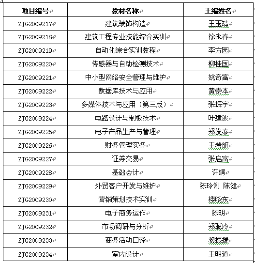 近日,根据《浙江省教育厅关于公布2009年度省高校重点教材建设项目的通知》(浙教高教〔2009〕196号文件),我校《建筑装饰构造》等18本教材被批准为2009年省高校重点教材建设项目。 此次,我校教务处组织专家评审,共择优推荐了21本教材到省教育厅参加评审,结果有18本教材通过评审,被批准为2009年省高校重点教材建设项目。这在立项的数目和申报成功率上在全省高职院校中都位居前列。另外,根据宁波市教育局《关于公布2009年宁波市高校特色教材建设立项项目的通知》(甬教高〔2009〕364号文件),我校有4本教材被立项为宁波市高校特色教材建设项目。