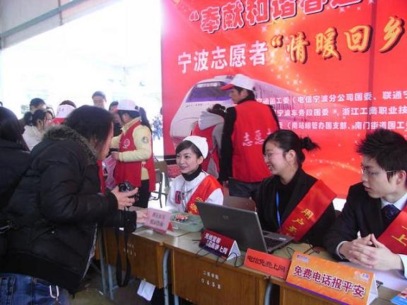 | 1月30日--2月6日,我校由团委组织,国际交流学院团总支为活动单位,精心选拔了70名志愿服务人员成立的服务小分队,在火车南站广场设立了“暖春行”志愿者服务站,开展“暖春行”社会实践活动,为旅客提供乘车咨询、乘客上车引导、公交引导、站内检票引导、搀扶老弱病残等特殊旅客进出火车站台,及免费提供热水、报刊、医疗、上网、电话等各项温馨志愿服务。本次活动受到了广大市民的一致好评,吸引了中央电视台、宁波电视台、《宁波日报》、《宁波晚报》等多家媒体的特别关注和报道。