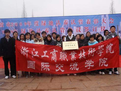 | 3月7日,由宁波市城区绿化委员会、宁波市园林管理局、宁波市风景园林协会主办的“宁波市2009年度绿地认养认管表彰大会暨2010年绿地认养认管协议签订仪式”在宁波中山广场举行。会上,我校国际交流学院团总支被授予2009年度宁波市城市绿地认养认管“护绿贡献奖”,并与市园林局续签了2010年绿地认养协议。这是国际交流学院团总支继2007年、2008年两度获得宁波市城市绿地认养认管“护绿贡献奖”后,第三次获此殊荣。