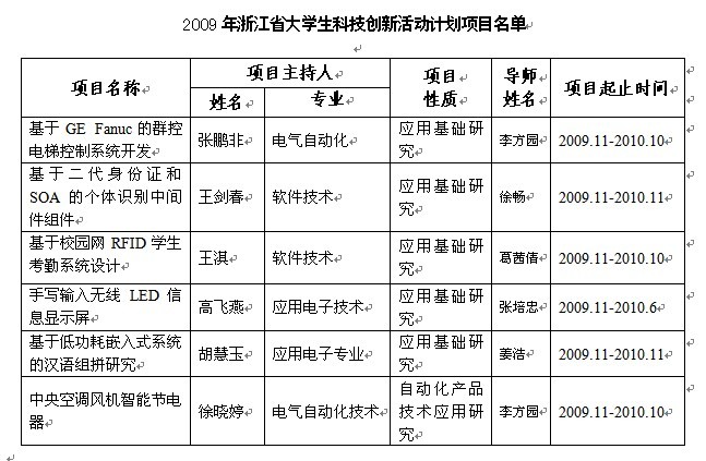 | 2009年浙江省大学生科技创新活动计划(新苗人才计划)于2009年12月启动实施,经过专家评审,我校团委选送的“基于GE Fanuc的群控电梯控制系统开发”科技创新项目等五项科技创新项目和“中央空调风机智能节电器”一项科技成果推广项目获得立项和资助。具体名单如下: