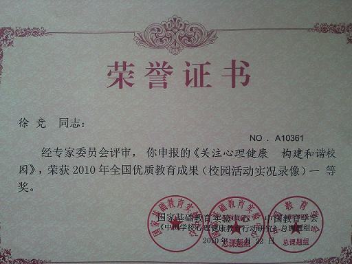| 日前,由中国教育专家委员会、中国教育部国家基础教育实验中心、“十一五”重点课题《中国学校心理健康教育行动研究》总课题组联合举办的“2010年全国优质教育成果大赛”落幕,我校心理健康指导中心申报的 《关注心理健康 构建和谐校园》获2010年全国优质教育成果(校园活动实况录像)一等奖,同时,徐竞老师撰写的《对有自杀倾向来访者的治疗》获优质教育成果(案例分析)二等奖。
