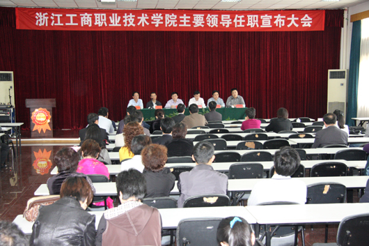 | 5月10日下午,学校主要领导干部任职宣布大会在至诚楼报告厅召开。省委教育工委干部处副处长黄亮宣布了省委、省政府关于蔡泽伟、谢一风同志任职的决定:蔡泽伟同志任浙江工商职业技术学院党委书记,谢一风同志任浙江工商职业技术学院院长。省委组织部干部三处副处长叶志航作重要讲话。省商业集团有限公司党委副书记陈向明、宁波市教育局党委副书记、副局长沈剑光、省商业集团有限公司组织人事部副部长黄胜泉、宁波市教育局组宣处处长苏泽庭等省市领导,以及我校其他校级领导、中层干部和副高以上人员120余人参加了会议。会议由陈向明书记主持。