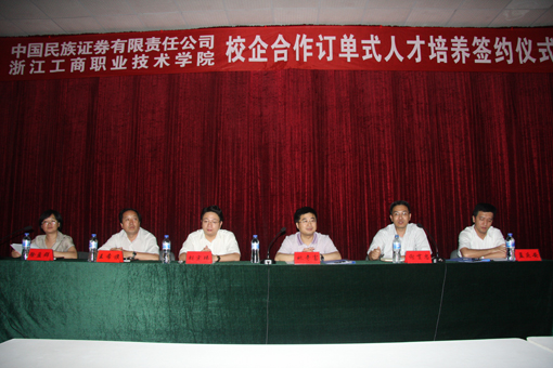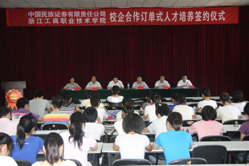 | 7月2日下午,我校与中国民族证券有限责任公司在至诚楼一楼会议室举行校企合作订单式人才培养签约仪式。姚奇富副院长、共青团宁波市委城区部胡宗玮副部长、宁波市证券期货业协会谢贯忠副会长、民族证券孟庆安总经理等领导出席了仪式,我校相关部门负责人及商学院投资与理财、金融保险专业的教师和学生共100多人参加了本次仪式。