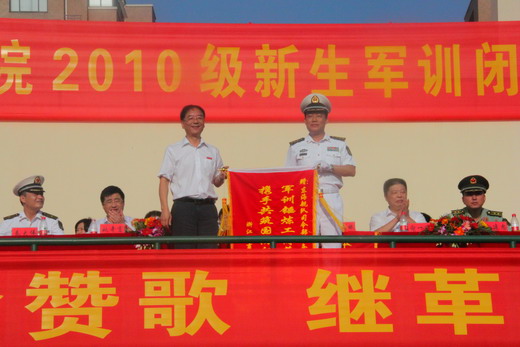 典礼上,蔡泽伟书记代表我校向东海舰队司令部军务处赠送锦旗,感谢他们对我校2009、2010级学生军训工作的大力支持。国际交流学院日语1021班陈佳明同学还代表2010级全体新生作了发言。