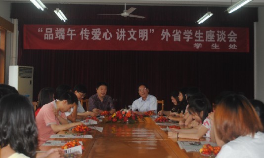 来自安徽的2011年省级优秀毕业生张德富和来自内蒙古的现任校学生会主席的赵欣分别作了典型发言,与大家分享了他们在宁波的生活、学习和工作点滴。35名外省籍学生代表踊跃发言,气氛热烈。 会后,蔡泽伟、谢一风还代表学校向同学们赠送了端午节礼物,给同学们带去了学校的关怀。