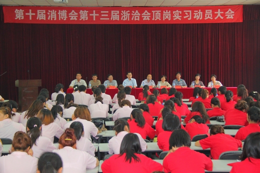 | 6月1日,第十三届浙江投资贸易洽谈会、第十届中国国际日用消费品博览会学生顶岗实习启动仪式在至诚楼一楼会议室隆重举行,宁波市对外贸易经济合作局副局长李新华、调研员丁超、信息中心主任黄立军,我校副校长俞位增,校长助理徐盈群等领导出席会议,400多名两会学生青年志愿者参加动员大会。
