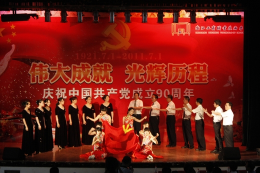 随后,举行了庆祝建党90周年文艺汇演。汇演在国际交流学院党总支选送的合唱《走向复兴》的歌声中拉开序幕,深情激扬的诗朗诵、耳熟能详的红歌唱,温婉柔美的歌伴舞等节目,讴歌了共产党好、伟大祖国好、改革开放好,展现了举旗帜、铸党魂、坚定信念跟党走的鲜明主题,汇演在校领导参与的校合唱团节目《走进十月的阳光》中圆满落幕。
