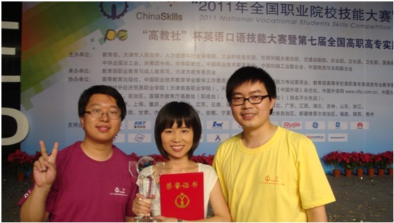 2011年全国职业院校技能大赛高职组“高教社”杯英语口语技能大赛暨第七届全国高职高专实用英语口语大赛于6月24日至6月27日在天津举行。我校英语0823班曹丽丽同学以全国第六名的成绩获得了本次大赛英语专业组二等奖。 本次大赛由教育部主办,是我校参加的技能比赛中最高级别的赛事。大赛分为英语专业组和非英语专业组,共有来自全国30个省市自治区的60名各省口语大赛专业组和非专业组特等奖选手参加了比赛。我校英语0823班曹丽丽同学以浙江省实用英语口语大赛特等奖的身份代表浙江省参加了本次比赛。在比赛中,她不畏强手、沉着发挥,最终以全国第六名的成绩夺得英语专业组二等奖。另外,在全校师生的支持下,曹丽丽同学以5万票获得了由网络票选产生的英语专业组最具人气奖。