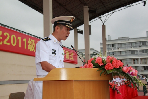 蔡泽伟在开营仪式上作重要讲话。他首先代表学校向2011级全体参训同学表示亲切问候,对大力支持我校军训工作的东海舰队领导表示衷心感谢,对承担此次军训任务的全体教官致以崇高敬意。他指出,开展大学生军训活动是国防建设的需要,也是学校全面贯彻党的教育方针,培养“四有”新人的具体体现。军训作为国防教育课程,是大学生活的第一课,也是大学生素质拓展、全面发展的一条有效途径。作为新世纪的大学生,不仅要具备扎实的书本知识、娴熟的职业技能,更要具有崇高的理想、良好的品质和敢于拼博、勇于吃苦的精神。通过军训,对培养和提高学生综合素质方面有着不可替代的积极作用。希望全体师生和有关部门做到以下几点:一是要充分认识军训的意义,尽快完成由个人生活到集体生活、由高中生到大学生的转变,以饱满的热情、积极的态度自觉投身到军训中去。二是要以军人的标准严格要求自己,服从命令、听从指挥,以振奋的精神状态接受军训的锤炼,一丝不苟地完成军训的各项任务。三是要增强安全意识,牢固树立安全第一的思想,防止意外事故发生,确保军训工作顺利进行。四是要发扬好传统、保持好作风,把军训成果转化到日常学习生活中去,使自身拥有扎实的理论知识,过硬的专业技能和良好的职业素养,为学校营造优良的学风和校风。五是要求各位老师要积极配合教官,关心和爱护学生,组织、协调好各项军训工作。学校相关部门要本着“一切为了学生”的宗旨,做好军训的后勤保障和安全保卫工作,确保军训顺利进行。