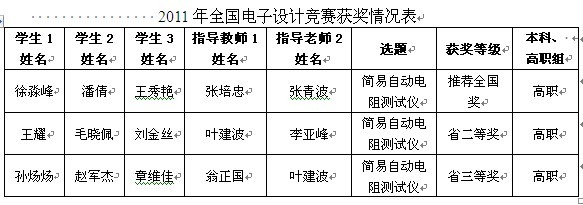 近日,2011年全国大学生电子设计竞赛浙江省选拔赛落下帷幕,我校工学院应用电子技术专业选派的三支代表队取得了优异成绩,竞赛综合排名位列全省高职院校前茅,共获得省一等奖{选送全国测评}1项、省二等奖1项、省三等奖1项。 此次大赛吸引了来自全国30个省、自治区和直辖市的1042所高校、10972支代表队,共计32946名同学参赛,是2003年全国大学生电子设计竞赛以来规模最大的一次。浙江省共有61所院校623组选手参加,其中高职类院校有24所。我校在该项赛事上取得的最好成绩是全国二等奖,今年是我校第四次入围该项赛事国家级奖项的评选。 几年来,我校工学院应用电子技术专业以创新实验室、特长生工作室为载体,开展了丰富多彩的实践教学活动,创新了人才培养模式,取得了优异的成绩。本次大赛获奖情况具体如下: