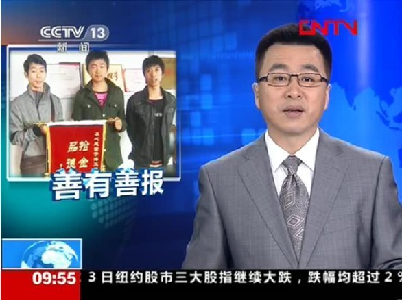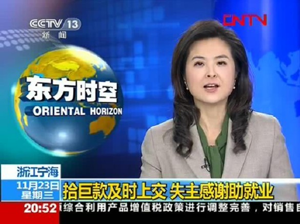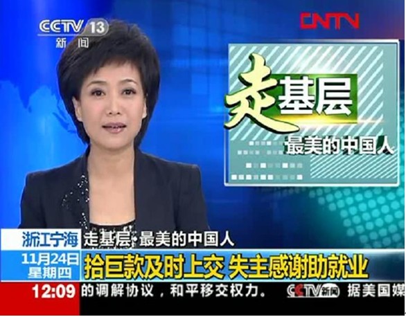 报道标题:拾巨款及时上交 失主感谢助就业 报道时间:2011-11-24 报道媒体:中央电视台 报道栏目:《新闻直播间》
