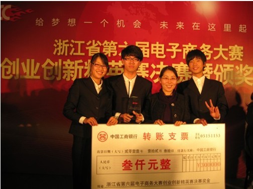 | 近日,由浙江省教育厅、浙江省经济和信息化委员会主办的2011年浙江省第六届高职高专院校电子商务大赛创业创新精英赛在杭州落下帷幕。我校商学院电子商务专业颜瑞星、朱清、徐泽等同学组成的团队(指导老师俞漪)凭借优异表现,夺得了本次大赛一等奖,并获得了团体二等奖,俞漪老师获“优秀指导教师”荣誉称号。