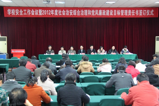 谢一风代表学校分别与各职能部门负责人、学院负责人签订了《2012年度社会治安综合治理和党风廉政建设目标管理责任书》。 最后,蔡泽伟在会上作了重要讲话。他就学校今年深化“平安校园”建设提出了三点要求:一是要统一思想,深刻认识做好校园安全工作的极端重要性。要求各部门要进一步提高认识,增强政治意识、责任意识,切实增强做好校园安全工作的责任感和紧迫感。要牢固树立“发展是硬道理,安全是硬任务”的理念,克服麻痹思想,处理好安全与发展的关系,深入分析校园安全工作中存在的问题与不足,全面排查校园及周边安全隐患,认真制定整改措施,以求真务实的工作作风落实各项安全工作措施,为广大师生创造良好的教学和生活环境,确保校园安全稳定;二是要增强责任意识,强化“两种机制”,首先是要强化“领导责任制”,必须从机制上切实保证校院(部门)两级安全责任制的落实到位,在实际工作中要做到“、一追究”。“三落实”即落实领导干部岗位责任制,按照“单位一把手负总责”和“谁主管谁负责”的原则,完善责任制,明确责任人,纳入考核内容,并入目标管理;落实领导开展调查研究以及协调会议制度,及时发现、研究、协调和处理各种矛盾和苗头问题,消除安全隐患;落实领导“包责制”,对定期排查出的矛盾隐患,要亲自挂帅,组织查处。“一追究”即建立追究责任制,对因工作失职导致本单位发生恶性事件或造成不良影响的,要追究有关领导责任。其次是要强化“分级负责机制”,对各类安全隐患,必须分解到位,责任到人,逐级解决,各单位要将综治工作纳入全年目标考核内容,明确目标任务,强化督促检查,实行一票否决,做到安全稳定工作与部门中心工作一同部署,一同检查,一同评比,做到年初有计划、有布置,年中有检查,年终有总结,表彰先进,鞭策后进,形成良好的激励机制,促进综治工作的有序运行;三是要夯实基础,切实提高学校自我管理和防范能力。要加强特殊学生群体的教育管理,强化校园矛盾纠纷排查调处的力度,强化预警机制,增强突发事件处置能力。他还指出,抓好我校安全稳定工作是实现我校跨越式发展和维护社会稳定的迫切需要,也是办好让人民满意的高等教育的迫切需要。我们一定要以高度的责任感和强烈的事业心,把这项工作抓紧、抓实,抓出成效,为学生的全面发展、健康成长,为推进“和谐工商”建设做出更大的贡献!