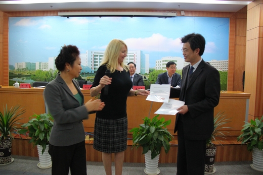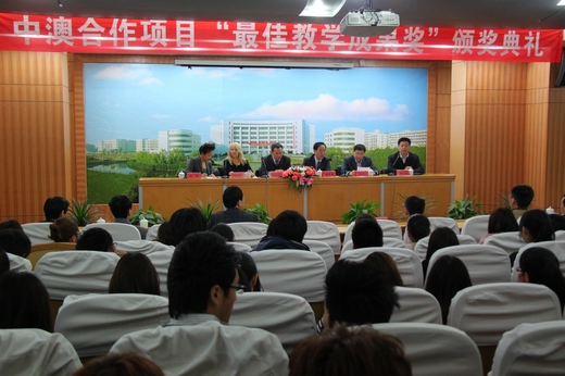 | 3月22日下午,霍姆斯格兰学院海外部经理Rhonda女士一行2人专程代表霍姆斯格兰学院来我校颁发最佳海外教学成果奖和优秀管理奖。这是霍姆斯格兰学院在海外10多个国家的合作办学项目中第一次颁发这样的奖项。我校党委书记蔡泽伟、校长谢一风、纪委书记李振祥、副校长徐永春等校领导以及中澳合作项目的师生出席了颁奖典礼。省教育厅外事处调研员吴伯刚,宁波市教育局国际交流与合作处处长汪维民作为特邀嘉宾出席本次活动。活动由谢一风主持。