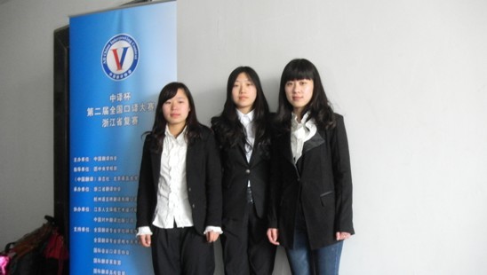 3月24日,第二届“中译杯”全国口译大赛浙江赛区比赛在杭州隆重举行。我校国际交流学院选派的3名选手分别荣获浙江省一、二、三等奖,这是我校学生在口译赛事中取得的最好成绩。 全国口译大赛由中国翻译协会主办,是目前我国口译竞赛级别最高、参赛面最广的一项竞赛。本次浙江赛区比赛全省共有42所高校120余名选手参赛,经过英中交替传译和中英交替传译两轮竞赛的激烈角逐,我校国际交流学院英语0922班张晓晓同学勇夺浙江赛区高职组一等奖,国商1064孙珊同学和英语0923班徐梦同学分获高职组二等奖和三等奖,我校成绩列全省高职组团体第二名,并获得优秀组织奖。