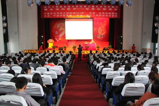 | 4月11日下午,由公共课教学部主办,校团委、校工会、教务处、各分院共同承办的校第三届大学生艺术节隆重开幕。校长谢一风、党委副书记应金萍、纪委书记李振祥等校领导和有关职能部门、各分院相关领导出席了本次开幕式。来自全校各分院近600名学生观看了开幕式暨‘永远的歌声’-----经典红歌赏析会。